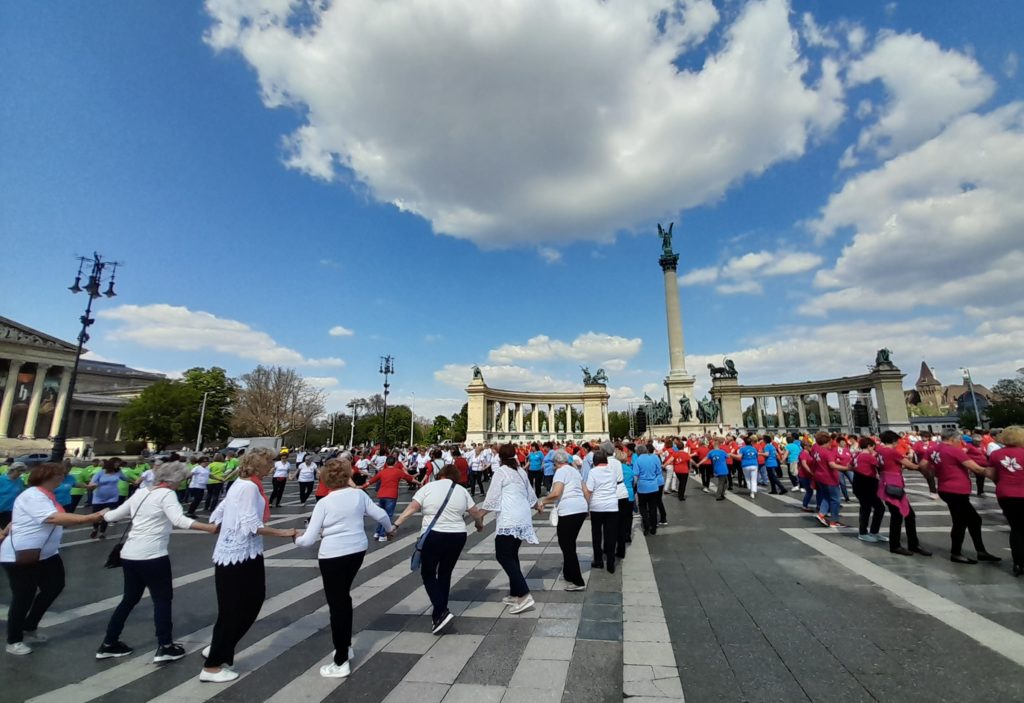 Országos szenior örömtánc flashmobot hirdettem a budapesti Hősök terére április 29-ére. Szerettük volna méltón ünnepelni ezt a napot, hiszen ma már Magyarországon 200 fölött van a szenior örömtánc oktatók száma és legalább 8000-10000 szeniorkorú heti rendszerességgel gyakorolja ezt a mozgásformát – írja szerkesztőségünkbe eljutatott beszámolójában Radvánszki Edit, a dunakeszi Redit Örömtánc Klub vezetője.