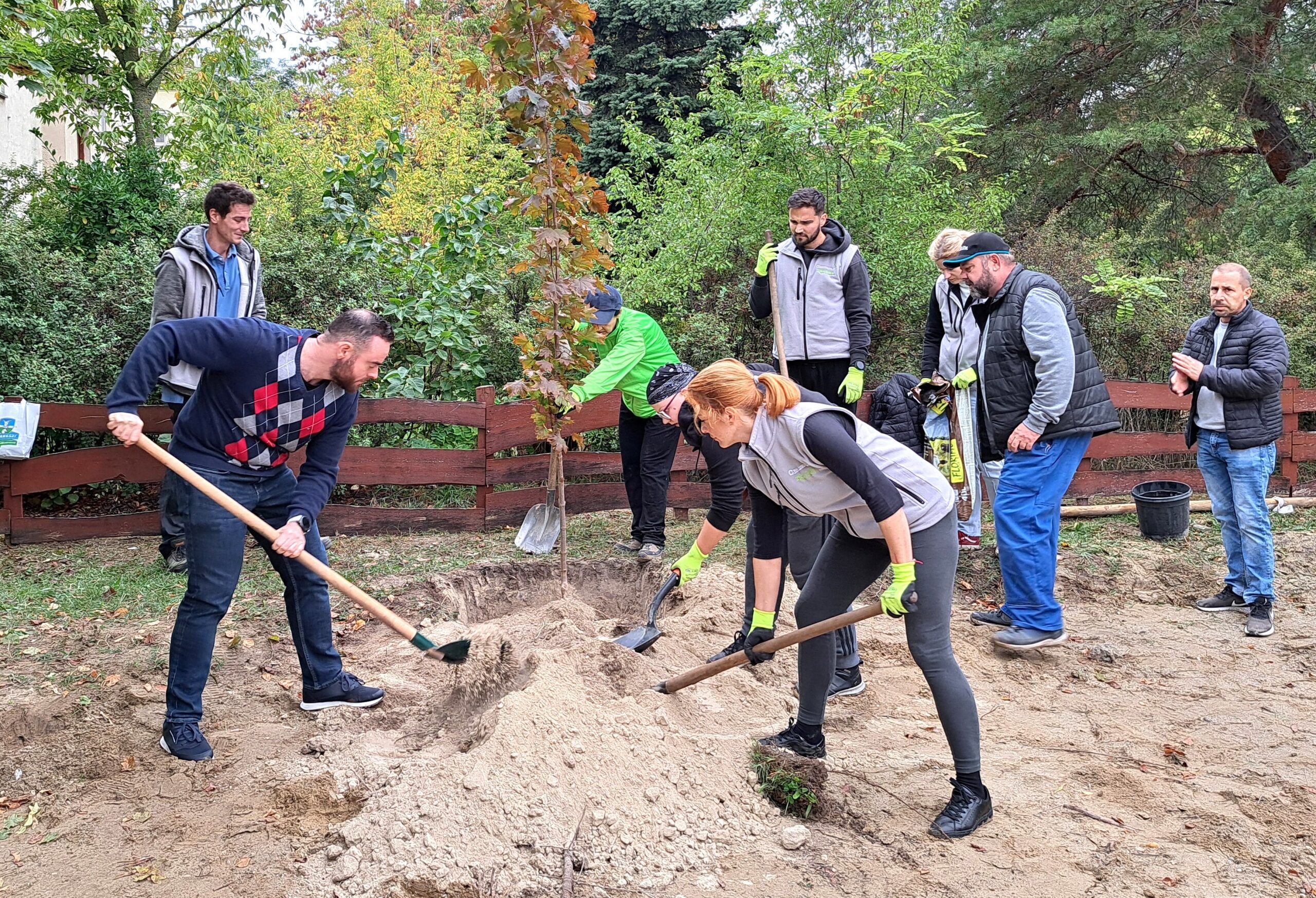 A tervek szerint a hosszú évek óta meglévő játszótér kerítés festése is része lett volna az akciónak, ám az esős időjárás miatt ez a feladat elmaradt. Ennek ellenére a faültetés jó hangulatban zajlott.