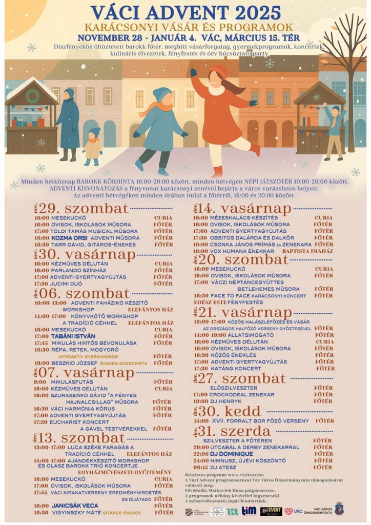 Advent első hétvégéjén kezdődik és vízkeresztig tart Vác főterén a hagyományos adventi vásár, amelynek kulturális-szórakoztató programjában fellépő lesz például Toldi Tamás, Kozma Orsi, Tabáni István, az Eucharist együttes, Janicsák Veca, DJ Dominique, a Váci Harmónia Kórus, a Váczi Néptáncegyüttes, a Face to face formáció, a Parlando színházi csoport…