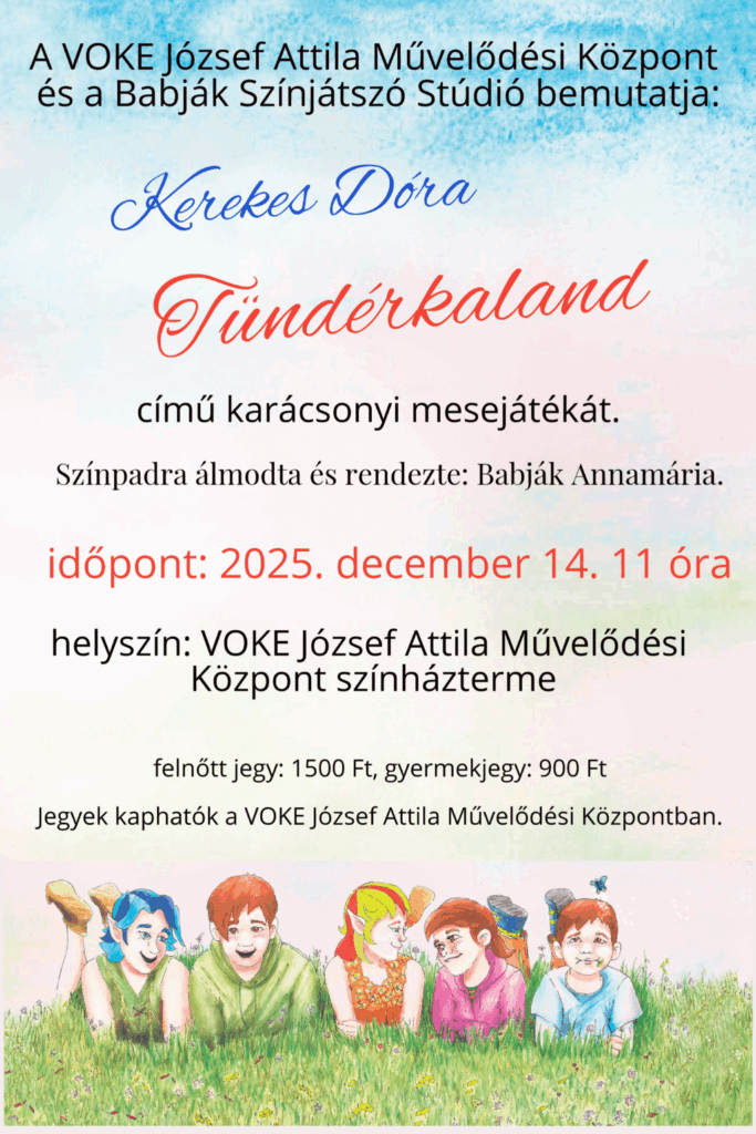A VOKE József Attila Művelődési Központ és a Babják Színjátszó Stúdió bemutatja Kerekes Dóra Tündérkaland című karácsonyi mesejátékát.