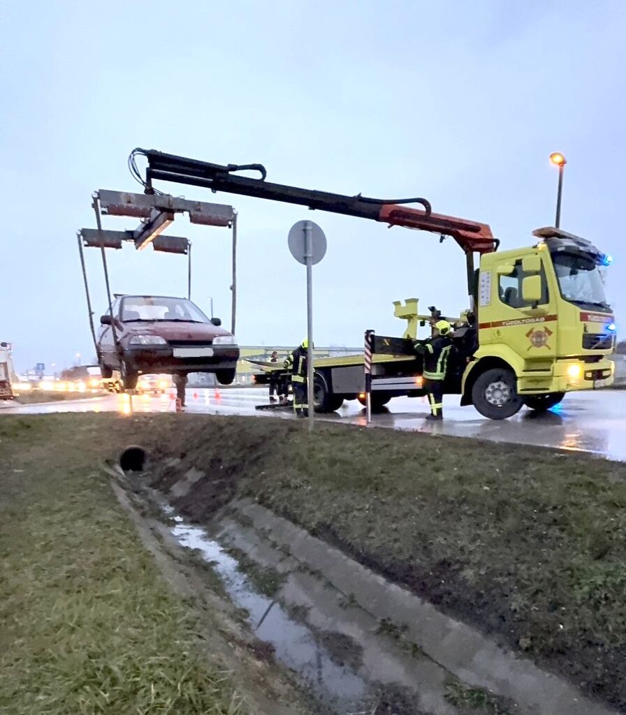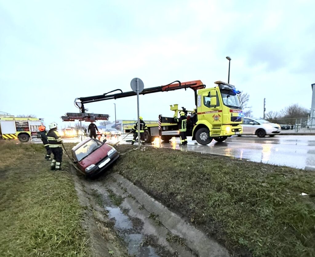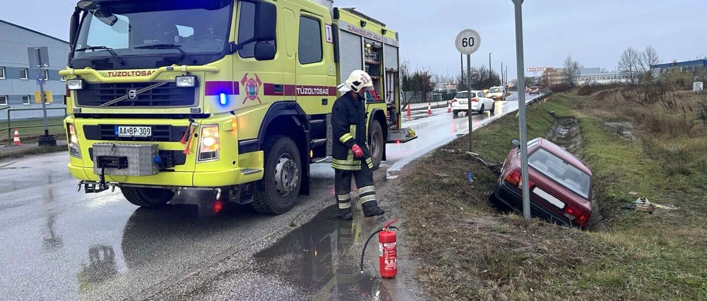 A késő délutáni órákban, az esős, nyirkos időben árokba csúszott egy személyautó Dunakeszin, a Pallag úton.