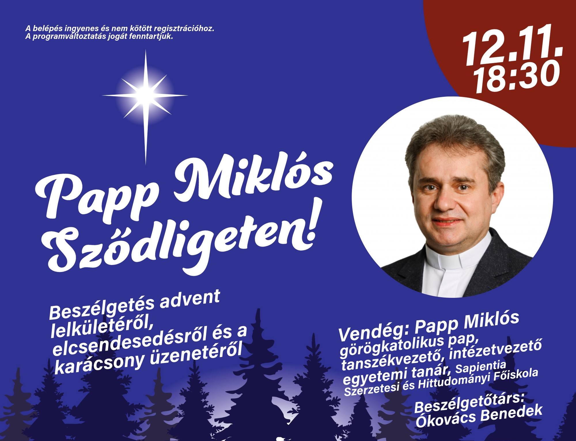 Az Advent Sződligeten programsorozatunk keretében december 11-én csütörtökön 18:30-tól Papp Miklós görögkatolikus pap, a Sapientia Szerzetesi és Hittudományi Főiskola tanszékvezető egyetemi tanára érkezik Sződligetre!– írja a rendezvény házigazdája, Ókovács Benedek.
