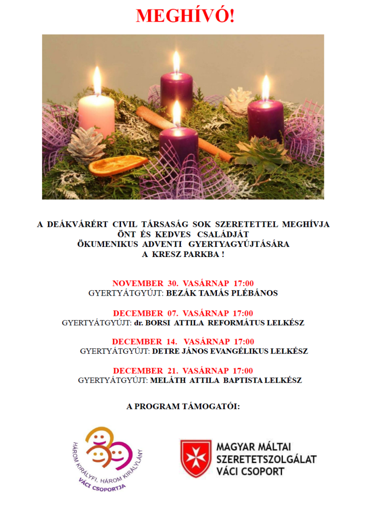 Az első, vasárnap 17 órai kezdettel tartandó alkalommal Bezák Tamás deákvári plébános lesz a gyertyát gyújtó igehirdető, aztán a következő három héten Dr. Borsi Attila református-, Detre János evangélikus-, majd Meláth Attila baptista lelkész.