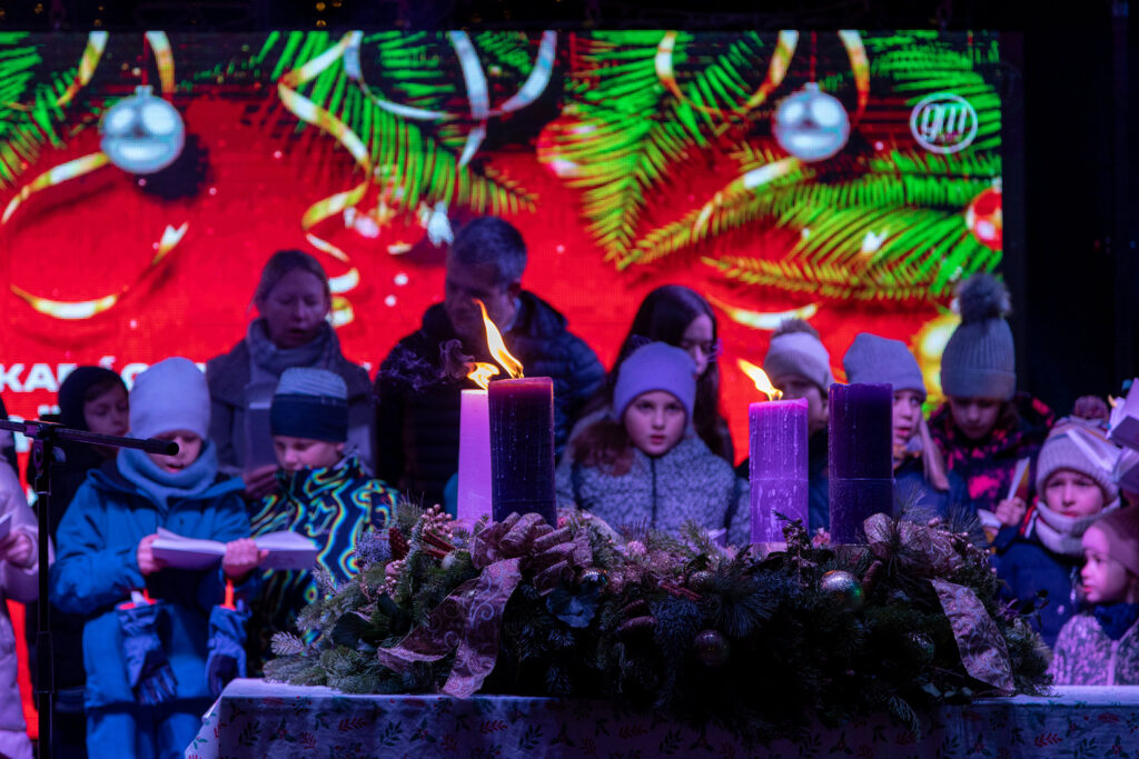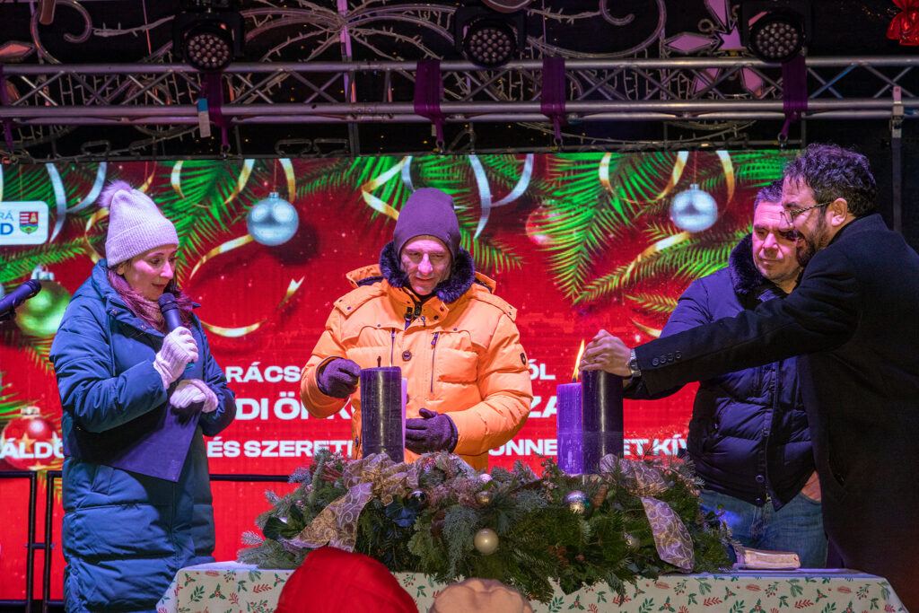 Dunakeszin advent harmadik vasárnapján dr. Petriné Chikán Katalin evangélikus lelkész és Szabó József egyházügyi tanácsnok gyújtotta meg a város adventi koszorúján az öröm beteljesedését kifejező gyertyát.