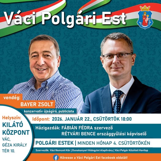 A jövő héten elérkezik a hónap negyedik csütörtöki napja, s vele együtt következik a Rétvári Bence országgyűlési képviselő kezdeményezte Váci Polgári Est sorozat új évadának első találkozója, amikor is Bayer Zsolt publicista lesz a kérdezett vendég a Piarista Kilátó Központban.
