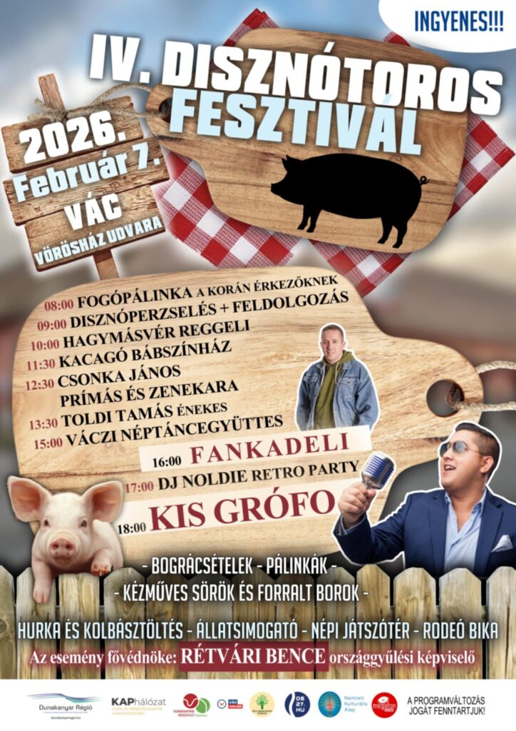 Igazi falusi disznótoros hangulat, egész napos programkavalkád és ismert fellépők várják az érdeklődőket Vácon, ahol 2026. február 7-én negyedik alkalommal rendezik meg a Disznótoros Fesztivált. A helyszín ezúttal is a Vörösház udvara lesz, a rendezvény pedig ingyenesen látogatható.