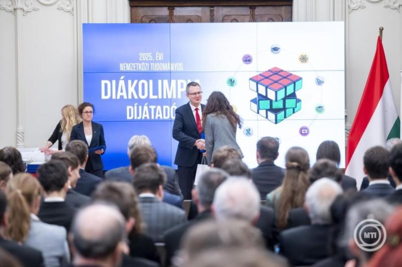 Borítókép: Budapest, 2026. január 30. Rétvári Bence, a Belügyminisztérium parlamenti államtitkára elismerést ad át a nemzetközi diákolimpiákon kimagasló teljesítményt felmutató tanulók, illetve az őket felkészítő pedagógusok elismeréseinek átadásán a Belügyminisztériumban 2026. január 30-án. MTI/Balogh Zoltán