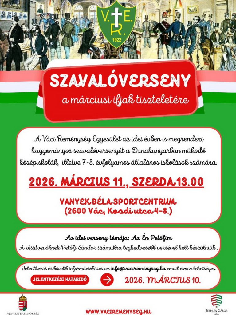 A Váci Reménység Egyesület régi szép hagyománya a március 15-e nemzeti ünnepéhez kapcsolódó szavalóverseny, amelyet az idén új helyszínként a Vanyek Béla Sportcentrumban rendeznek meg, az esemény időpontja március 11-e 13 óra.
