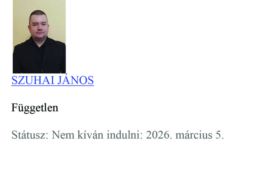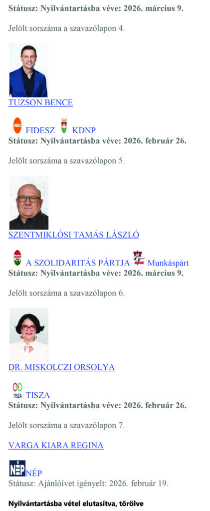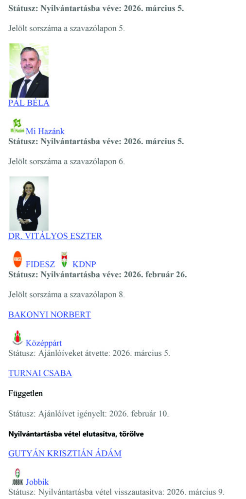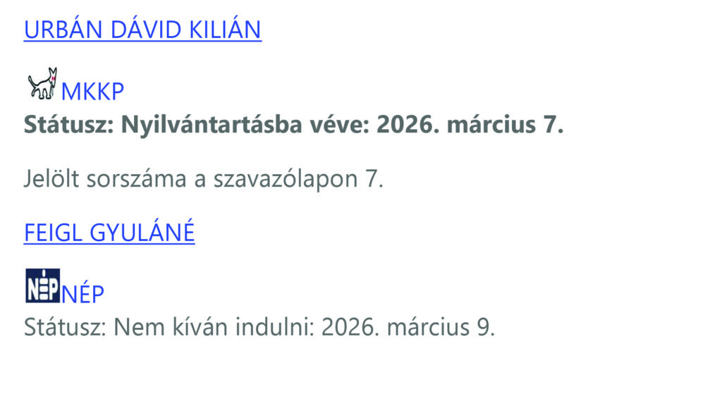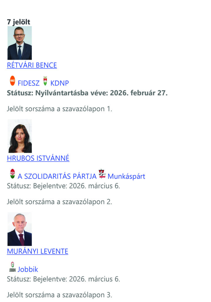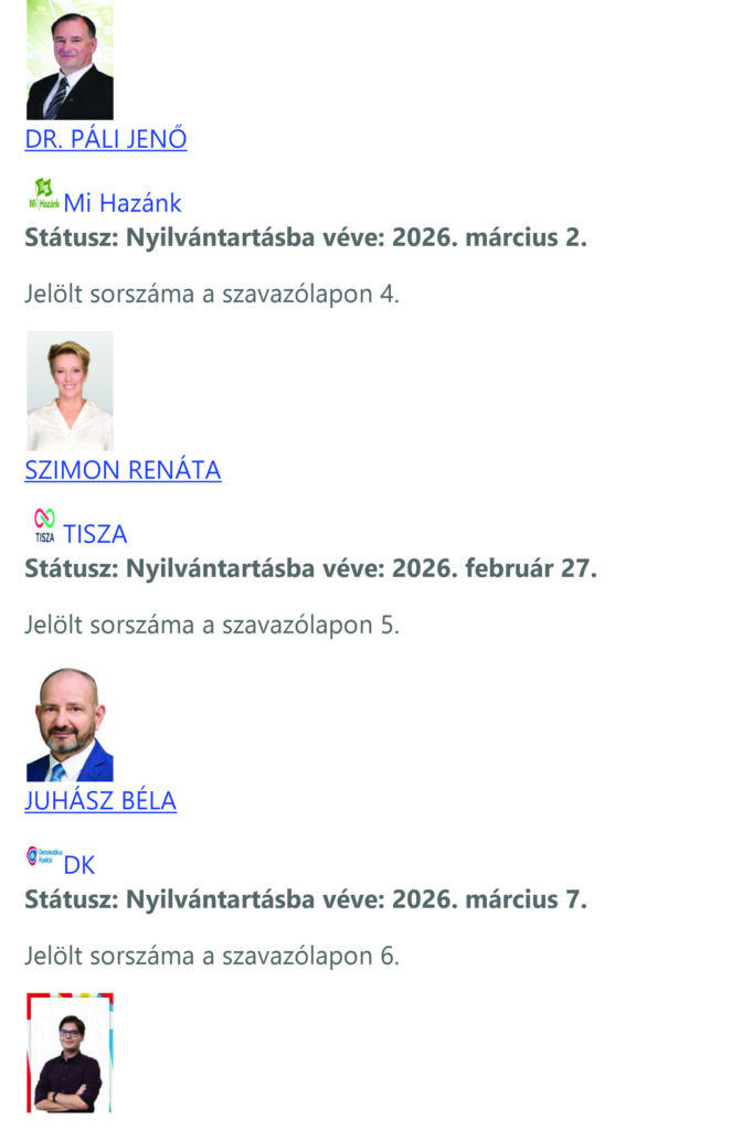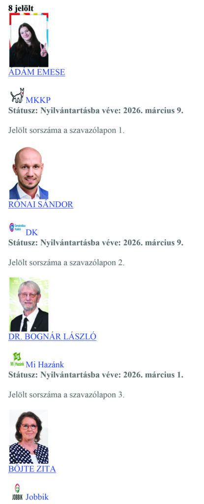 Régiónk három – a Pest vármegyei 04. számú, a Pest vármegyei 05. számú és a Pest vármegyei 11. számú – országgyűlési választókerületében a valasztas.hu 2026. március 9. 21:00:00 órakor közzétett adatai alapján eddig 18 országgyűlési képviselő-jelöltet vettek nyilvántartásba a helyi választási bizottságok.
