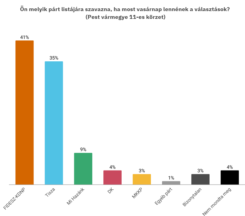 A kutatás szerint, ha most vasárnap tartanák a választásokat a Pest vármegyei 11-es számú választókerületben – amelynek központja Vác –, akkor a pártpreferenciák a következőképpen alakulnának: