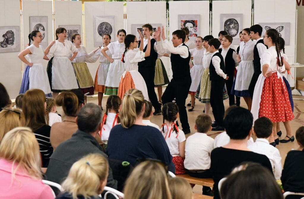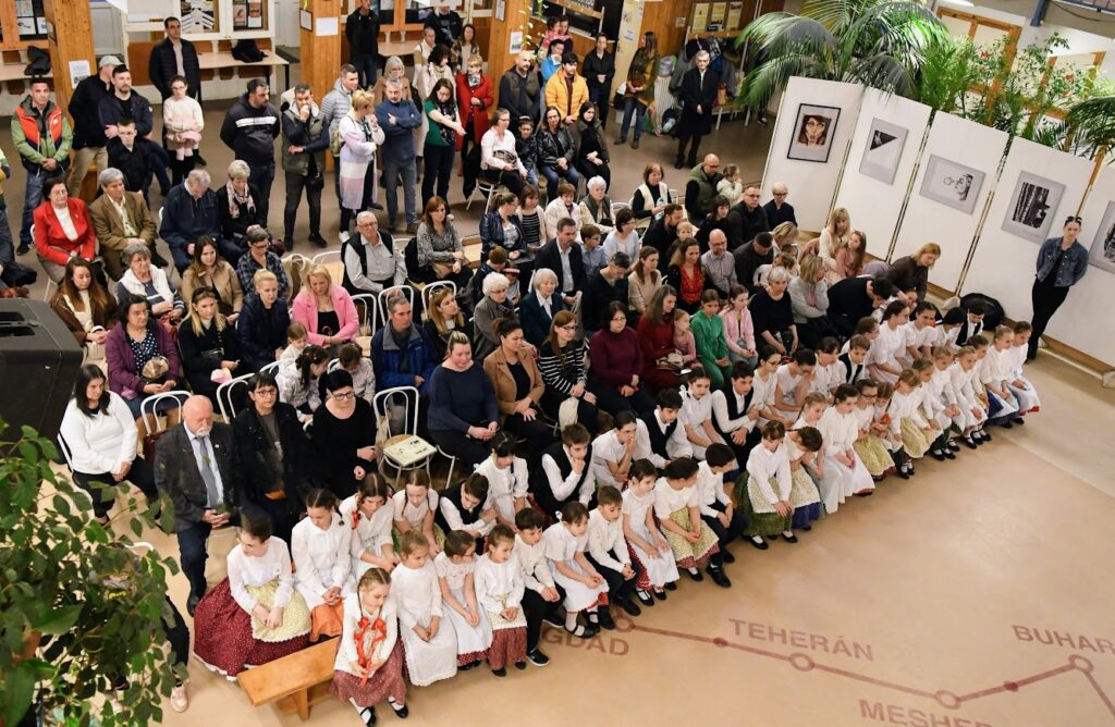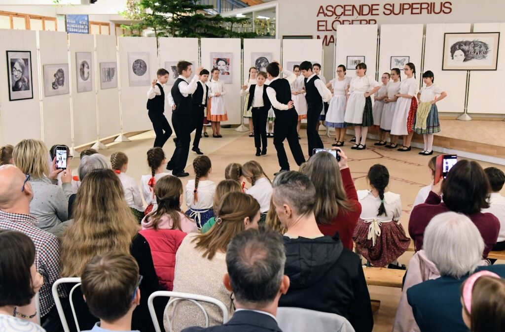 A kiállítás megnyitón közreműködők: a Kőrösi Táncegyüttes csoportjai, a Napraforgók, a Nap és Hold táncosai iskolánk virtuális értéktárának nagyon is valós kincsei. A népi viseletbe öltözött kicsinyek és nagyobbacskák szimpla látványa, a lányok lendülettől repkedő hajfonatai, pörgős szoknyája, a fiúk mozdulataiban már benne sejlő férfiúi öntudat gyönyörűség a nézőknek. A nagyobbak alig 4-5 évnyi előnye az ének- és tánctanulásban elsősorban Tóth Zoltán művészeti vezető, és tanítványai közül oktatóvá növekedett Csehi Emília táncpedagógiájának sikere, ékes bizonyítéka. Jól látható és érzékelhető, hogy a nagyoknak már zsigereibe íródott a ritmus, a tempó, az együttműködés automatizmusa, már övék a tánc öröme, ami magával ragadja a közönséget is.