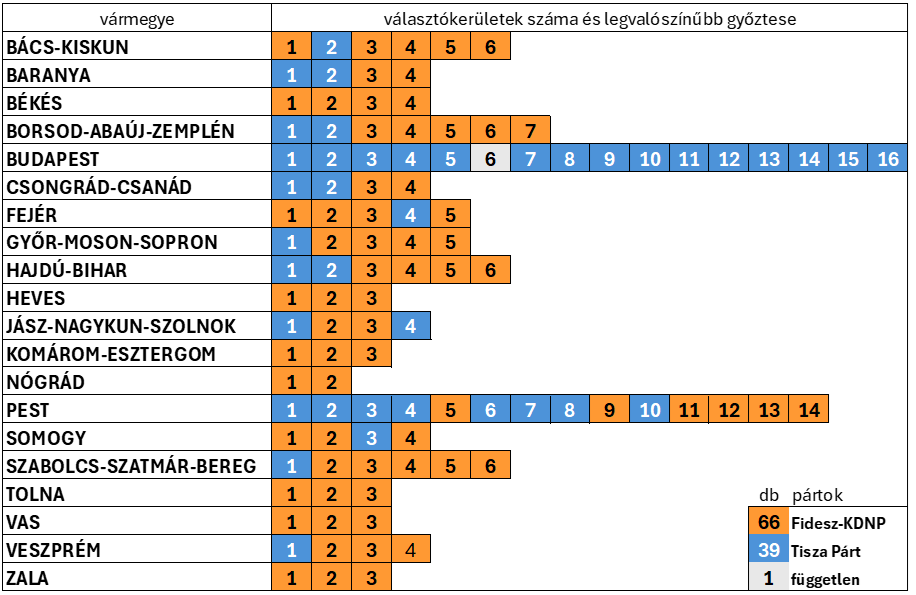 Mivel a Fidesz támogatottsága vidéken, a Tisza Párté a városokban erősebb, nem meglepő, hogy a kormánypártok jelöltjei elsősorban a kisvárosias és községek által dominált választókerületekben diadalmaskodhatnak. Ezzel szemben Miskolcon, Debrecenben, Szegeden, Pécsett vagy Nyíregyháza és Győr egyes részein a Tisza Párt jelöltjei esélyesebbek.