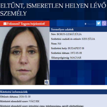 Boros-Leskó Júlia pénteken Deákvárról indult a belváros felé. 162 cm magas, nagyon vékony testalkatú. Öltözete nem ismert. Valószínűleg egyedül van. Péntek délután (01.30.) indult el otthonából, szomorú, zavart lehet – tették közzé a police.hu-n.